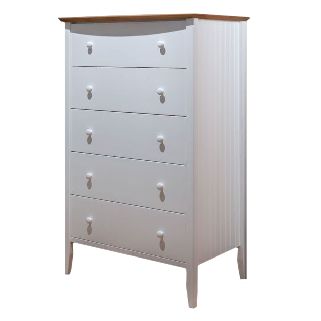 Discover the Coastal Five-Drawer Chest, an alluring piece that combines coastal charm with a unique mission and craftsman style. Crafted with a solid cherry top and five spacious, functional drawers, this chest is as practical as it is beautiful. Its exceptional craftsmanship features hand-grooved sides and a pristine, white hand-applied finish, creating a refreshing and luxurious seaside atmosphere that inspires and uplifts any room.