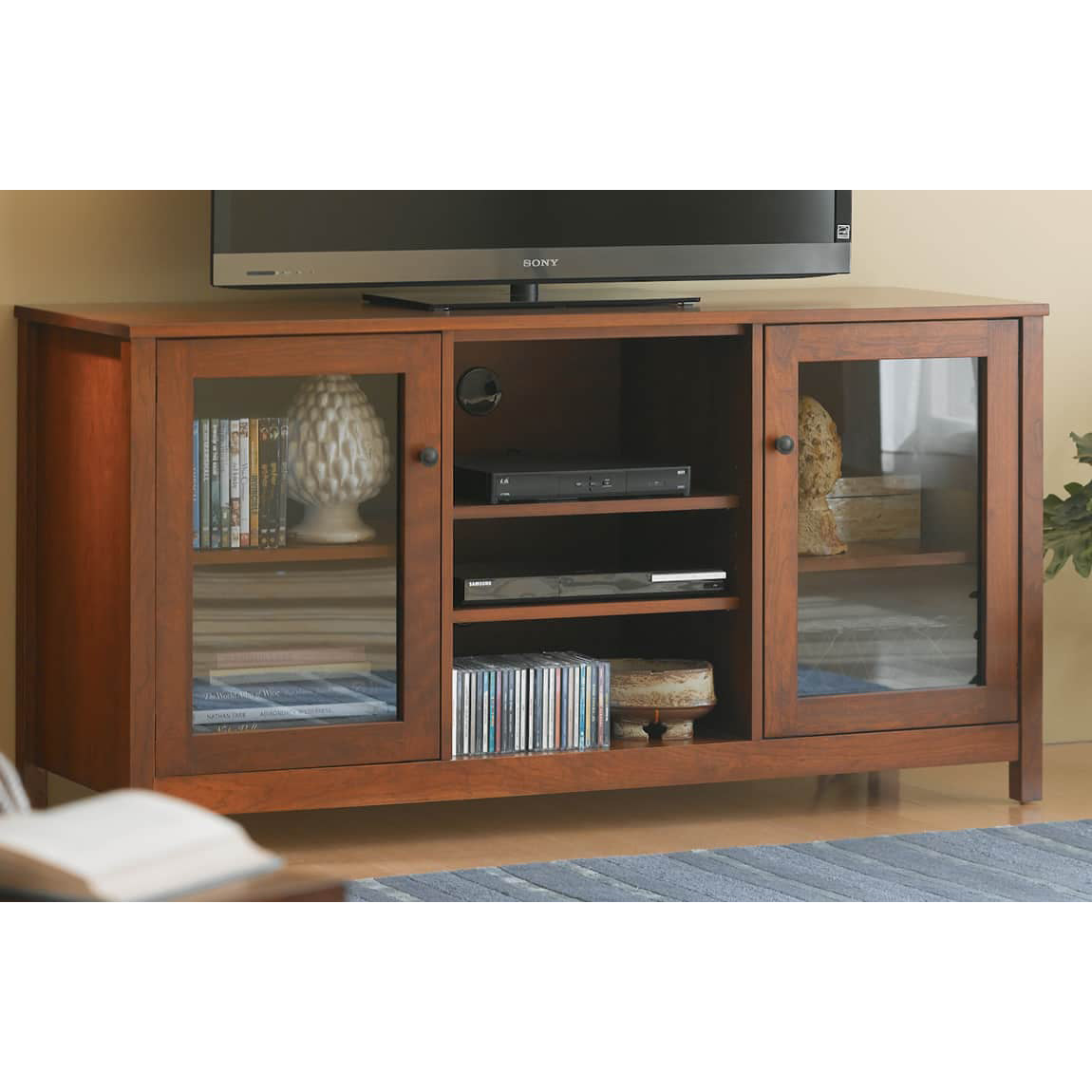 Introducing the classic 60-inch Shaker-style wood television console, featuring rich finishes that beautifully showcase the wood grain. This console is enhanced by slightly tinted, tempered glass doors, adding a touch of sophistication while ensuring durability and safety. Its timeless design and functional elegance make it a perfect addition to any room.