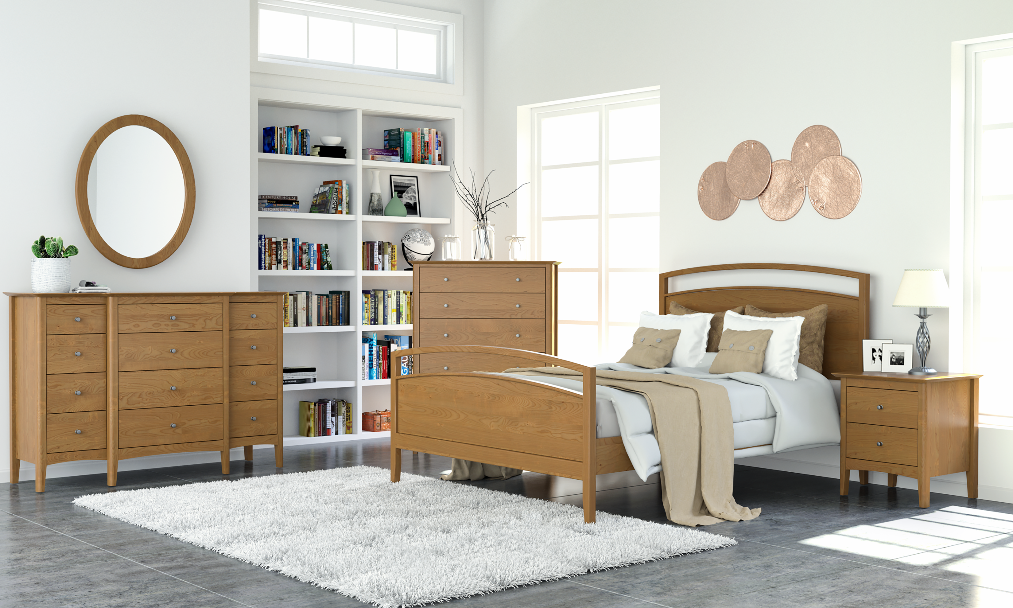 The Armstrong Collection of Vermont furniture showcases gracefully curved lines inspired by mid-century modern design, radiating refined elegance and timeless appeal. This stunningly reimagined classic elevates your bedroom space, seamlessly merging simplicity with sophistication. Each piece in the collection is thoughtfully crafted to enhance the beauty of your surroundings while providing a functional and stylish addition to your home.